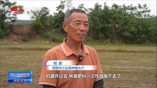 綿陽市三臺(tái)縣種植大戶 何新:機(jī)器開過去,秧苗肥料一次性就施下去了,省力省人工,它的秧苗返青快,比手插秧提早3天返青。
