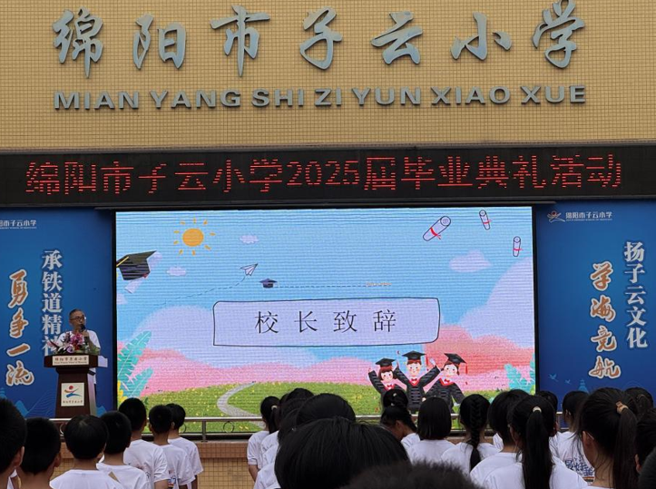 齊誦結(jié)束后,綿陽市子云小學(xué)校長何國堂發(fā)表致辭,他既肯定了畢業(yè)生的成長,更寄語全體同學(xué):“畢業(yè)不是終點(diǎn),而是人生新程的起點(diǎn),愿你們永葆好奇、堅(jiān)守善良,在更廣闊的天地里勇敢追光。”發(fā)言結(jié)束后,畢業(yè)生代表向校長及教師代表鞠躬致謝、向父母們深深鞠躬,用最樸素的方式傳遞感恩之情。
