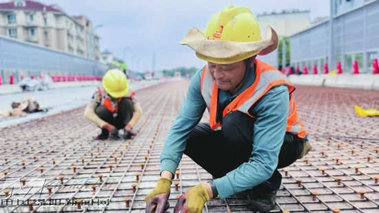 在三匯立交橋施工區(qū)現(xiàn)場,記者看到,橋下交通已恢復(fù),往來車輛依照地面交通標線和信號燈有序通行。新的三匯立交橋主體已完工,工人們正在橋面進行鋼筋綁扎、混凝土鋪設(shè)作業(yè)。