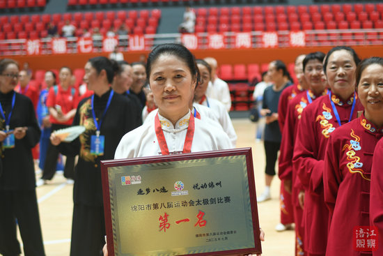 獲得四十二式太極劍集體項(xiàng)目冠軍的北川代表隊(duì)成員走下領(lǐng)獎(jiǎng)臺(tái),個(gè)個(gè)笑顏如花。“我們這一次奪冠,大家都非常激動(dòng)和自豪,辛苦的付出獲得了收獲。”北川代表隊(duì)教練王春蓉告訴記者,團(tuán)隊(duì)共9個(gè)成員,平均年齡在60多歲,最大的68歲,最小的58歲,從三個(gè)月前就開(kāi)始備戰(zhàn)。