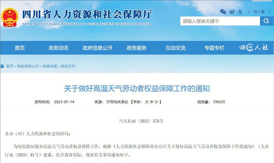 7月14日,四川省氣象局發(fā)布消息,盆地階段性高溫天氣持續(xù),局地氣溫將達40℃以上。高溫天氣下,該如何保障勞動者權(quán)益?近日,四川省人力資源社會保障廳發(fā)布關(guān)于做好高溫天氣勞動者權(quán)益保障工作的通知,強調(diào)要充分認識高溫天氣對勞動者特別是環(huán)衛(wèi)工人、快遞員、外賣員等戶外作業(yè)勞動者帶來的危害,把保護勞動者生命安全擺在首位,加大工作力度,采取有效措施維護好高溫天氣下勞動者合法權(quán)益,全力保障勞動者生命安全和身體健康。
