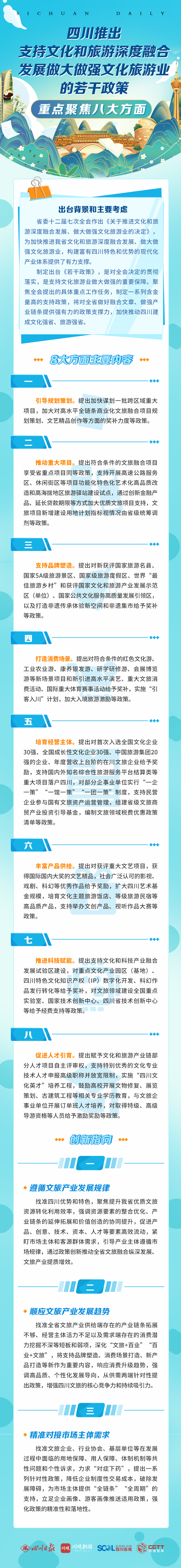 7月22日,記者從四川省文化和旅游廳官方網(wǎng)站獲悉,省委辦公廳、省政府辦公廳日前印發(fā)的《關(guān)于支持文化和旅游深度融合發(fā)展做大做強(qiáng)文化旅游業(yè)的若干政策》,從圍繞引導(dǎo)規(guī)劃策劃、推動(dòng)重大項(xiàng)目、支持品牌塑造等8個(gè)方面,推出了一系列含金量高的支持政策,對全省做好文旅深度融合文章、做強(qiáng)產(chǎn)業(yè)鏈條提供強(qiáng)有力的政策支撐力。