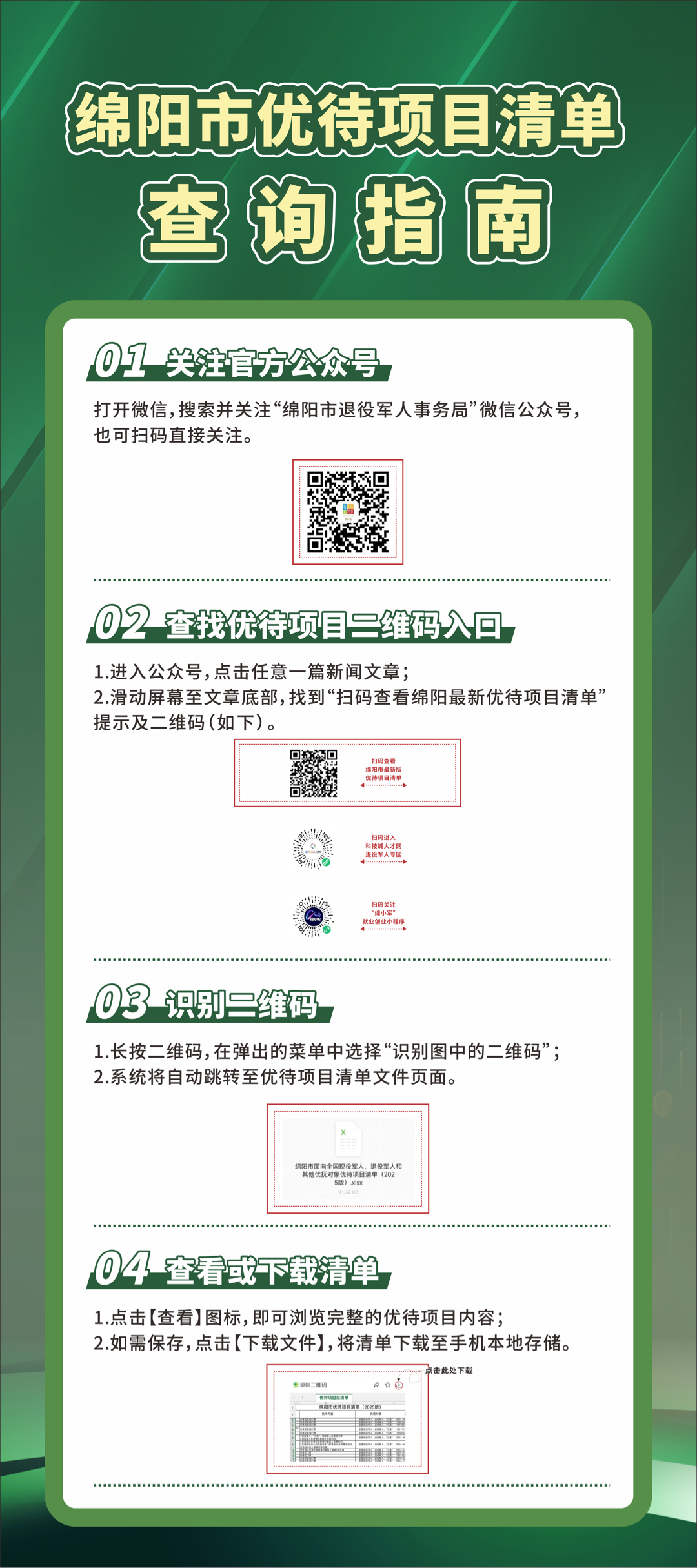 想要了解具體優(yōu)待項(xiàng)目,可關(guān)注綿陽(yáng)市退役軍人事務(wù)局微信號(hào)。
