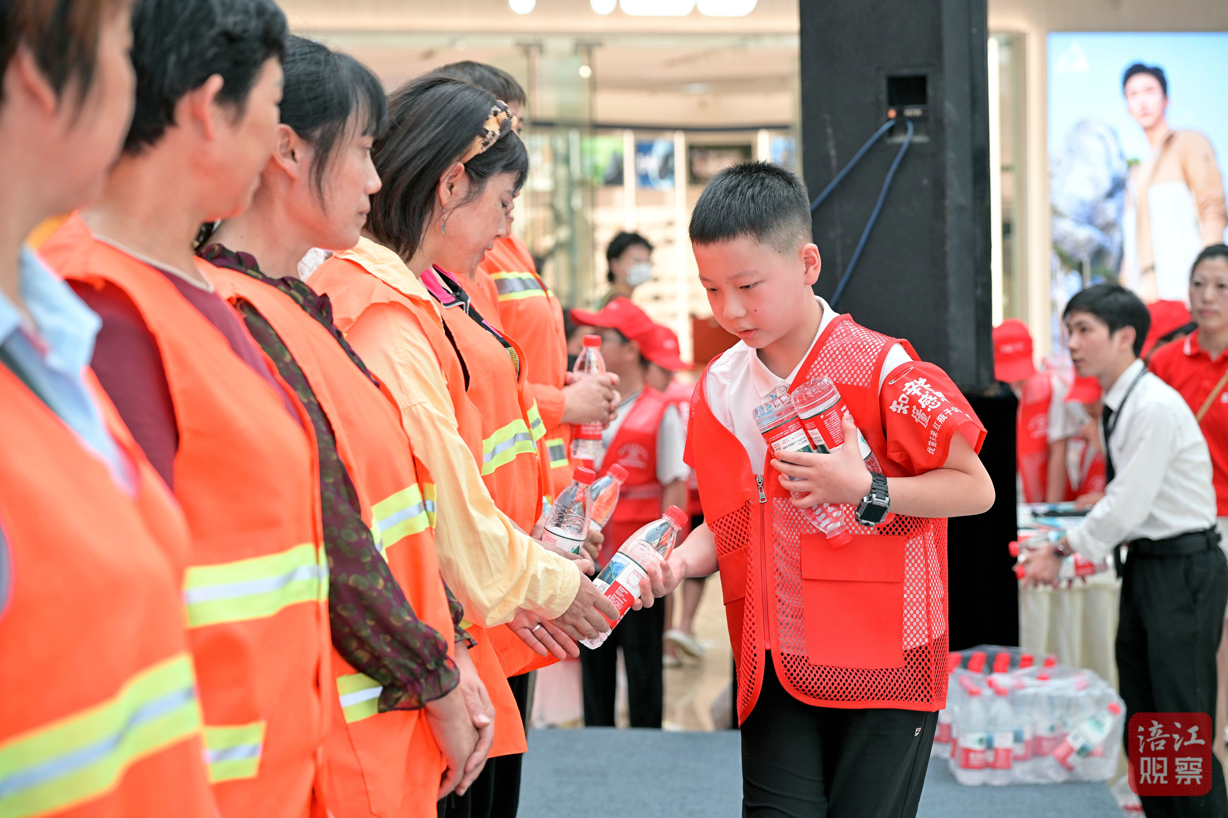 “阿姨,天氣炎熱,送您一瓶水,注意不要中暑了。”在涪城區(qū)萬達(dá)商圈,9歲的小志愿者陽奕涵踮起腳,將一瓶貼著祝福語的農(nóng)夫山泉遞給正在工作的環(huán)衛(wèi)工人。“參加此次活動,我體會到了這份工作的艱辛與不易,以后會更加珍惜他們的勞動成果,保持城市環(huán)境的干凈整潔。”