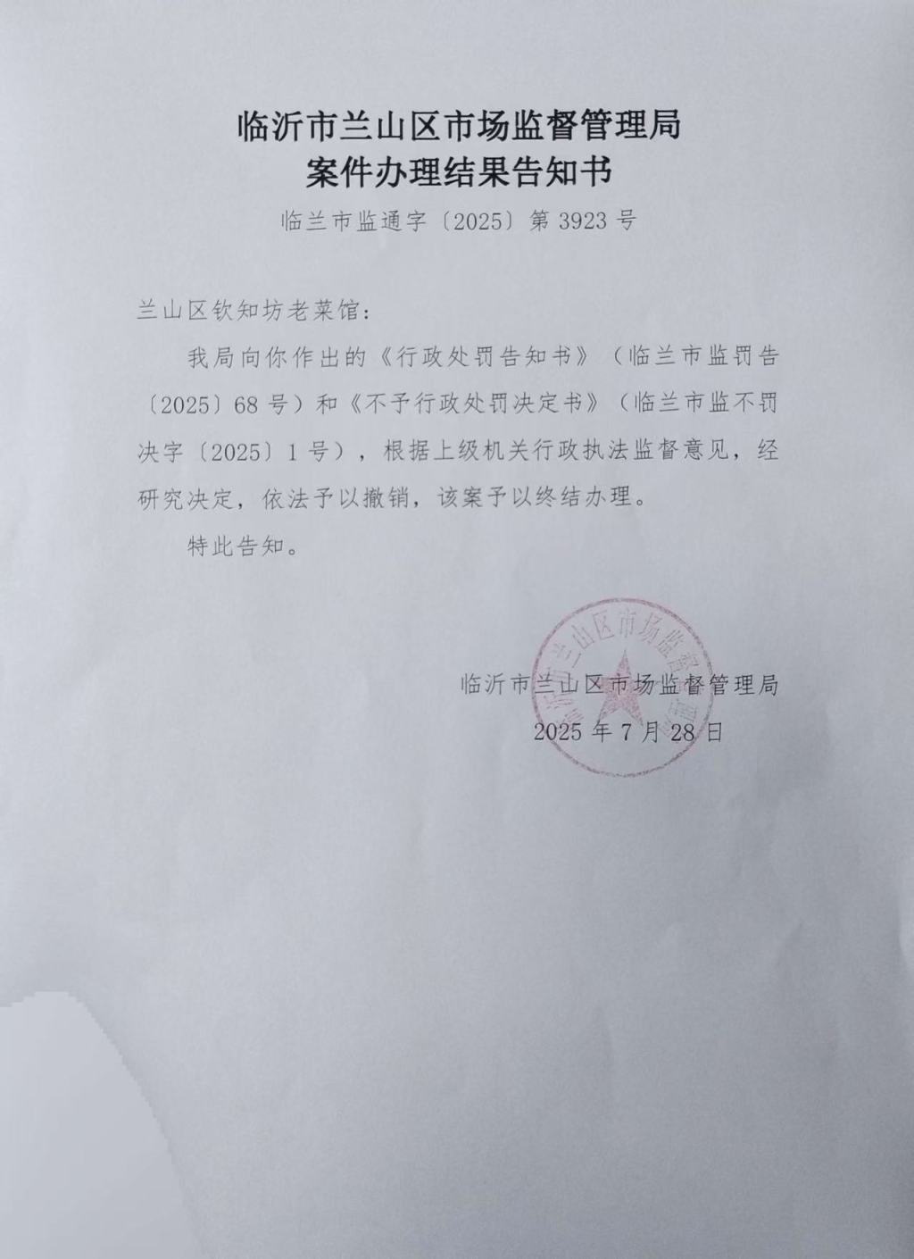 山東臨沂一餐館因老板發(fā)布“蛤蟆湯”菜品視頻擬被罰款45萬(wàn)元一事又有新進(jìn)展,7月28日,臨沂市蘭山區(qū)市場(chǎng)監(jiān)督管理局向涉事的欽知坊老菜館送達(dá)《案件辦理結(jié)果告知書(shū)》,明確撤銷(xiāo)此前針對(duì)該店的兩項(xiàng)執(zhí)法文書(shū),案件正式終結(jié)辦理。