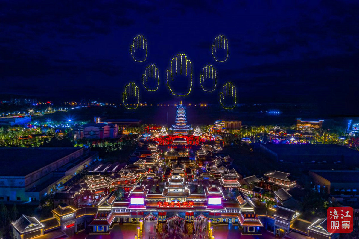 夜幕降臨,重頭戲才剛剛開始。千架無人機(jī)騰空而起,在夜空中變幻出寶劍、俠客、太極等武俠元素。緊接著,絢爛的煙花綻放在天際,與無人機(jī)光影交相輝映,將“機(jī)甲武林”的奇幻氛圍渲染到極致,不少游客情不自禁鼓掌喝彩。“像在看一場科幻武俠大片!”一位帶著孩子的母親笑著說。