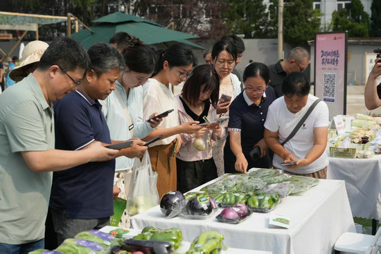 市民正在市集上通過(guò)掃描“JN碼”了解蔬菜信息。新華社發(fā)
