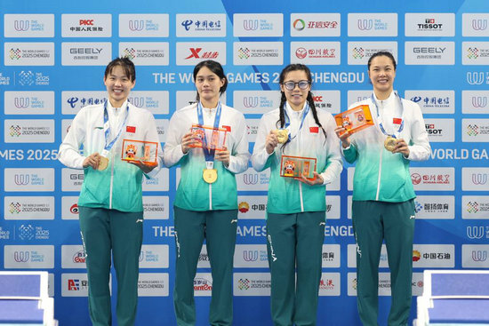 8月10日,中國(guó)隊(duì)選手胡瑤瑤、舒程靜、謝文敏、許藝川在女子4×100米水面蹼泳接力頒獎(jiǎng)儀式上。新華社記者 張麗蕓 攝