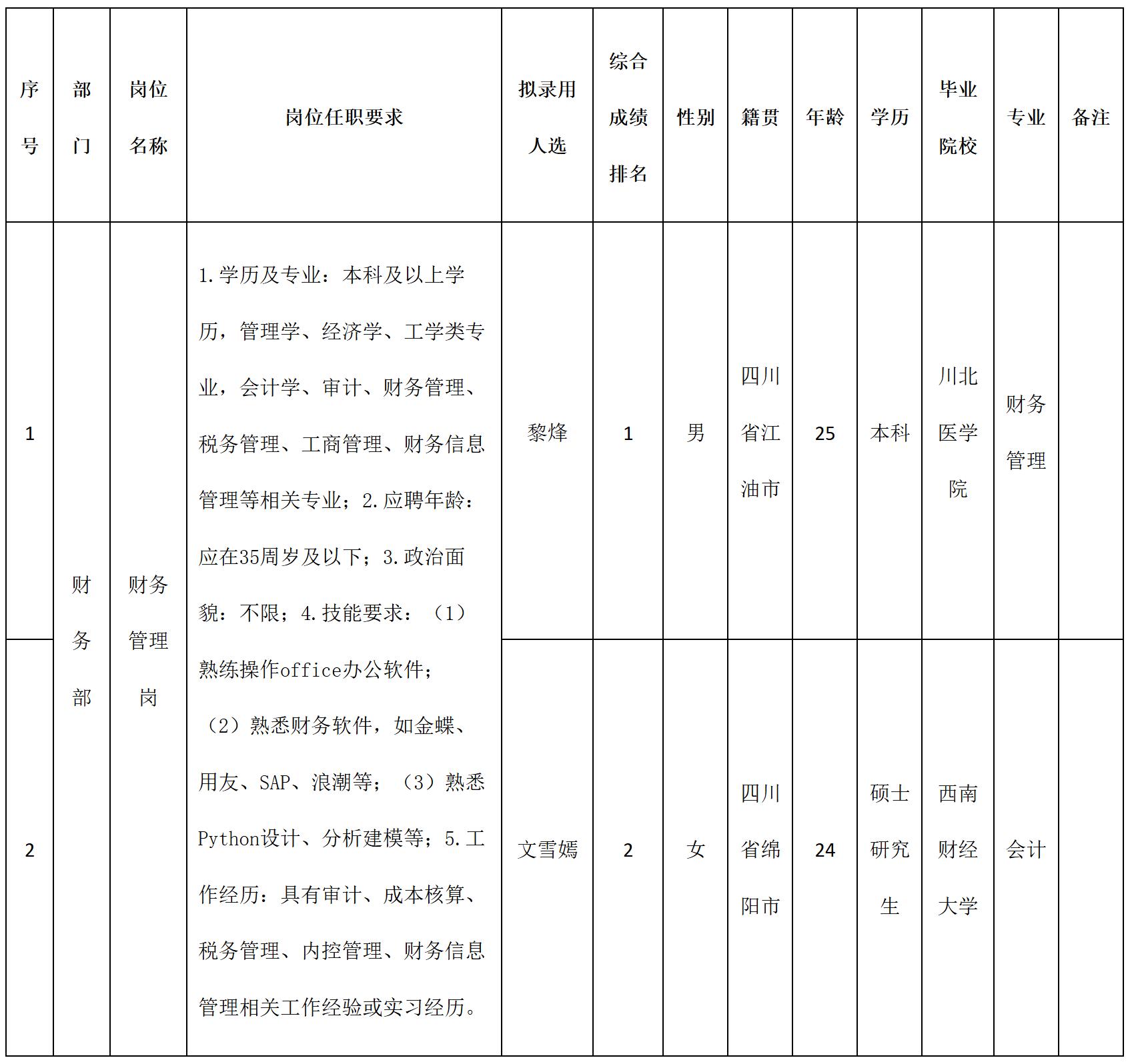 根據(jù)四川九洲空管科技有限責(zé)任公司發(fā)布的招聘公告及招聘相關(guān)規(guī)定,經(jīng)筆試、面試、考察、體檢等程序,擬錄用黎烽等2名同志到四川九洲空管科技有限責(zé)任公司工作,現(xiàn)予以公示,具體情況如下: