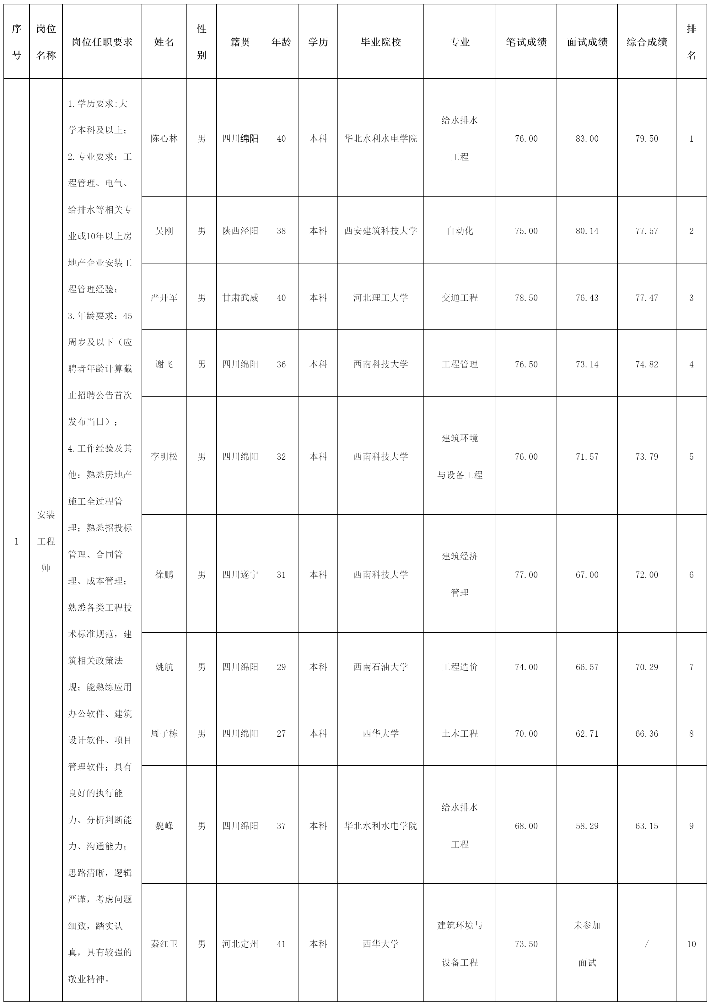 根據(jù)綿陽市綿投置地有限公司發(fā)布的招聘公告及招聘相關(guān)規(guī)定,經(jīng)筆試、面試等程序,現(xiàn)將筆試、面試成績(jī)予以公示。