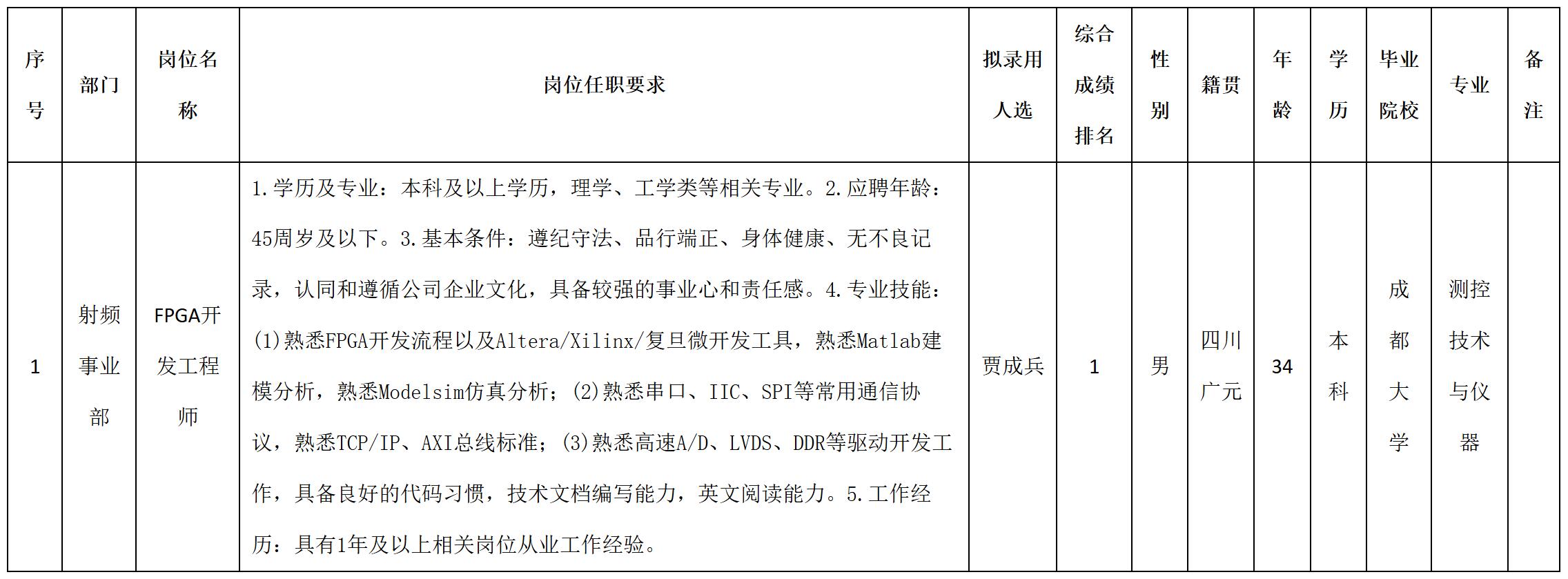 根據(jù)四川九強(qiáng)通信科技有限公司發(fā)布的招聘公告及招聘相關(guān)規(guī)定,經(jīng)筆試、面試、考察、體檢等程序,擬錄用賈成兵同志到四川九強(qiáng)通信科技有限公司工作,現(xiàn)予以公示,具體情況如下: