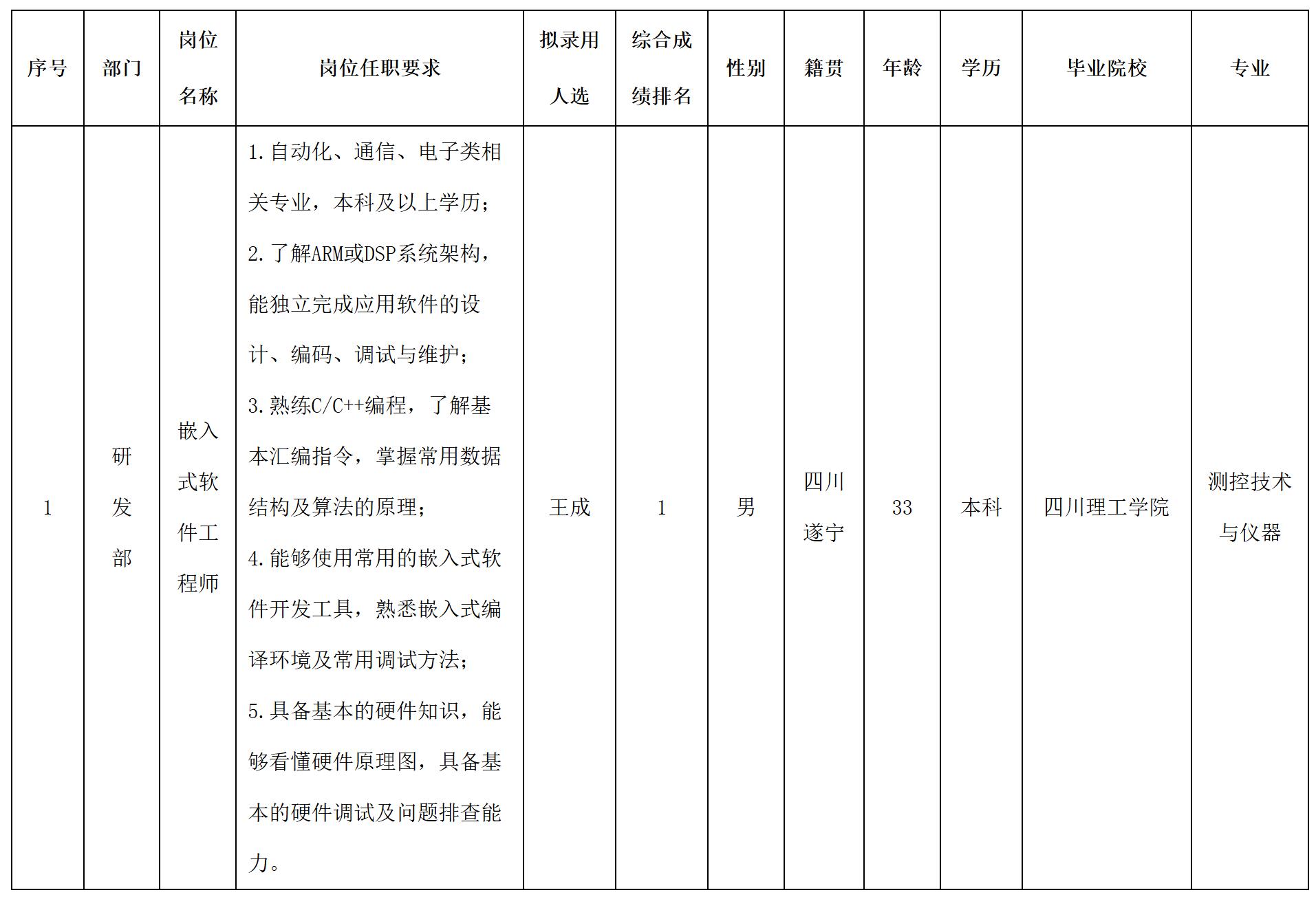 根據(jù)四川奧庫科技有限公司發(fā)布的招聘公告及招聘相關(guān)規(guī)定,經(jīng)面試、考察、體檢等程序,擬錄用王成同志到公司工作,現(xiàn)予以公示,具體情況如下: