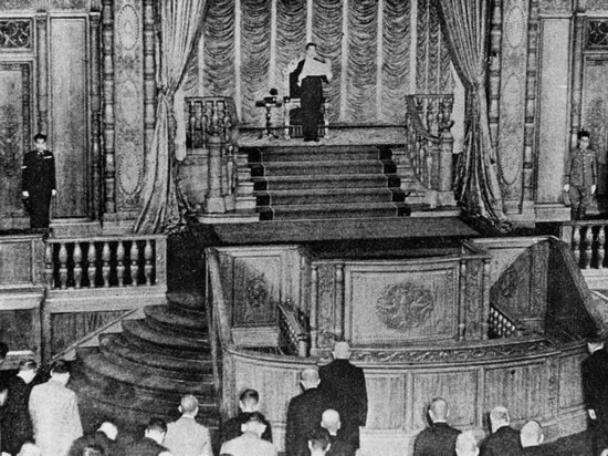 1945年8月15日,日本天皇裕仁廣播“終戰(zhàn)詔書”,宣布日本無(wú)條件投降。圖為日本天皇在議會(huì)宣布投降。新華社發(fā)