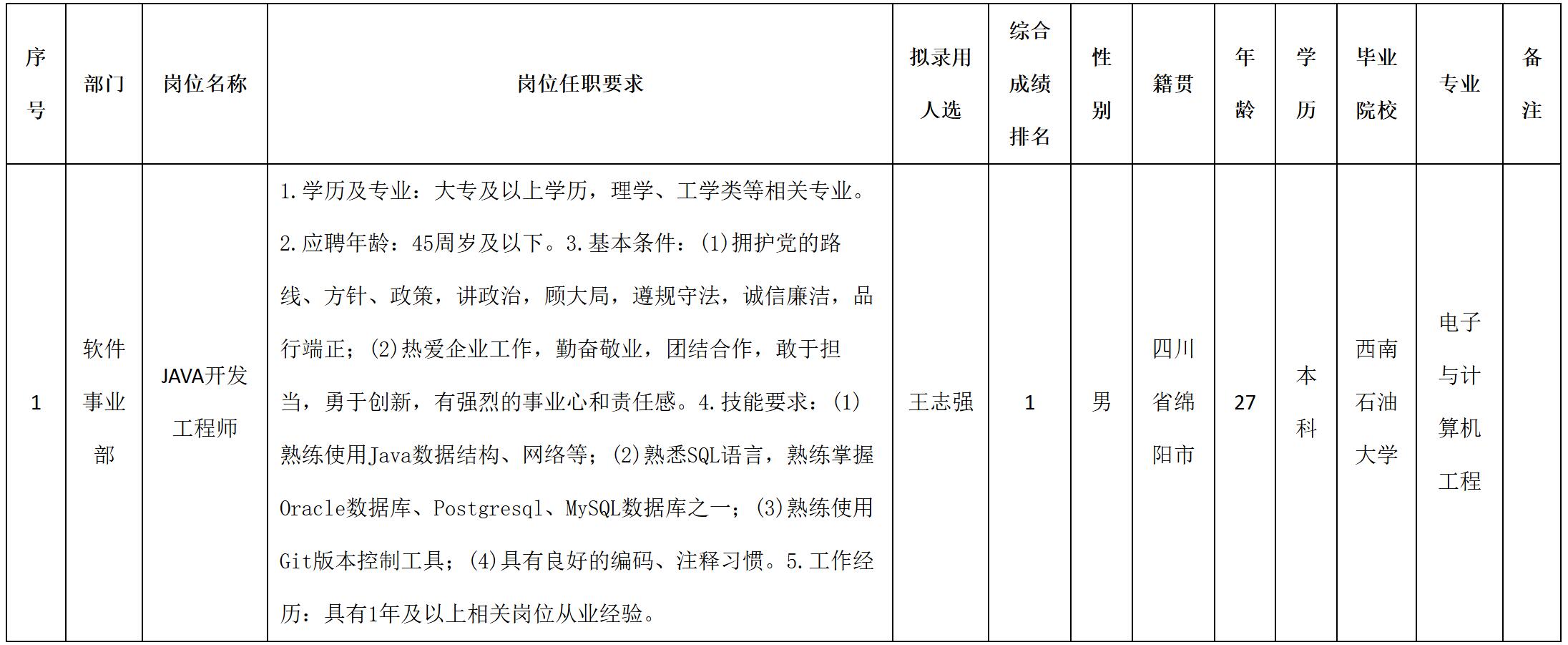 根據(jù)四川九強(qiáng)通信科技有限公司發(fā)布的招聘公告及招聘相關(guān)規(guī)定,經(jīng)筆試、面試、考察、體檢等程序,擬錄用王志強(qiáng)同志到四川九強(qiáng)通信科技有限公司工作,現(xiàn)予以公示,具體情況如下: