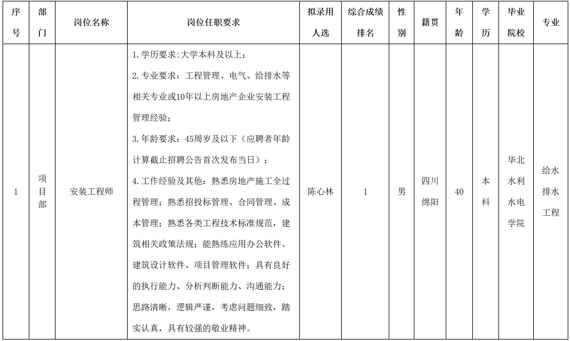 根據(jù)綿陽(yáng)市綿投置地有限公司發(fā)布的招聘公告及招聘相關(guān)規(guī)定,經(jīng)筆試、面試、考察、體檢等程序,擬錄用陳心林同志到綿陽(yáng)市綿投置地有限公司工作,現(xiàn)予以公示,具體情況如下: