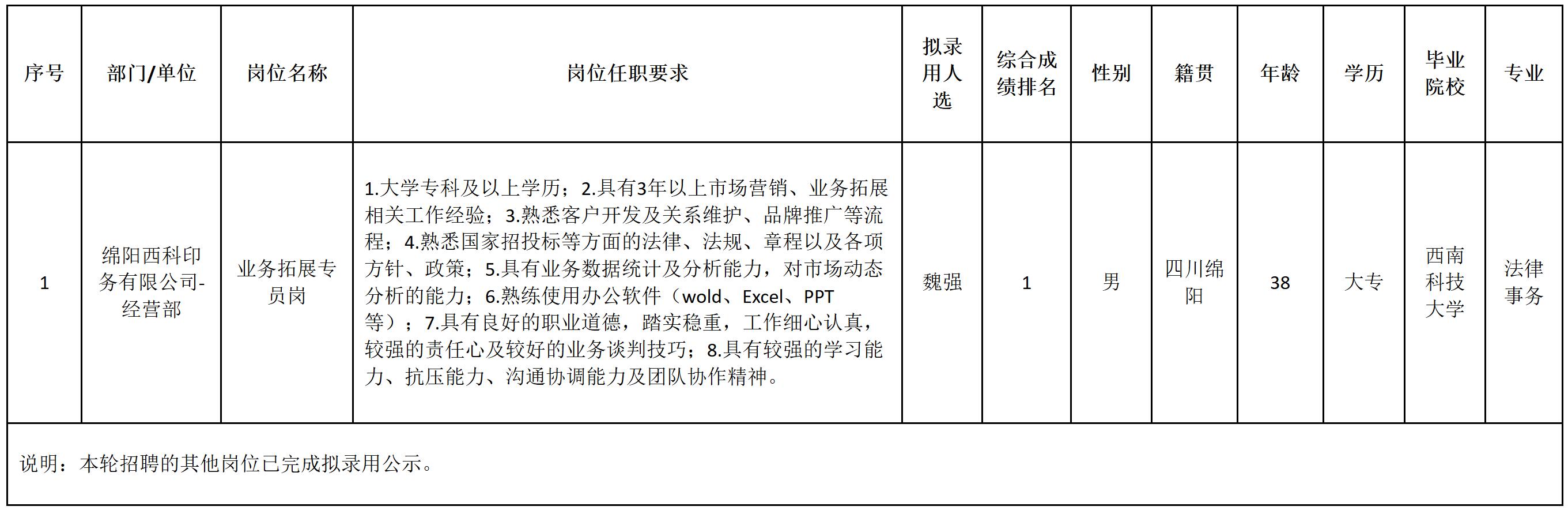 根據(jù)交發(fā)實(shí)業(yè)發(fā)布的招聘公告及招聘相關(guān)規(guī)定,經(jīng)初試、復(fù)試、體檢等程序,擬錄用魏強(qiáng)同志到交發(fā)實(shí)業(yè)下屬西科印務(wù)工作?,F(xiàn)予以公示,具體情況如下: