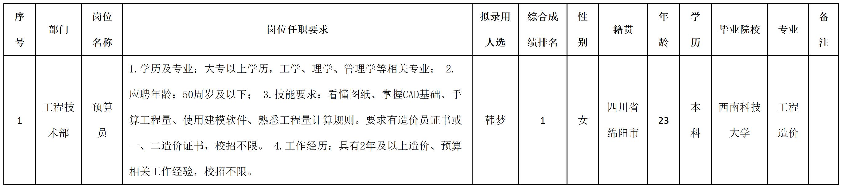 根據(jù)四川九洲建筑工程有限責(zé)任公司發(fā)布的招聘公告及招聘相關(guān)規(guī)定,經(jīng)筆試、面試、考察、體檢等程序,擬錄用韓夢(mèng)同志到四川九洲建筑工程有限責(zé)任公司工作,現(xiàn)予以公示,具體情況如下: