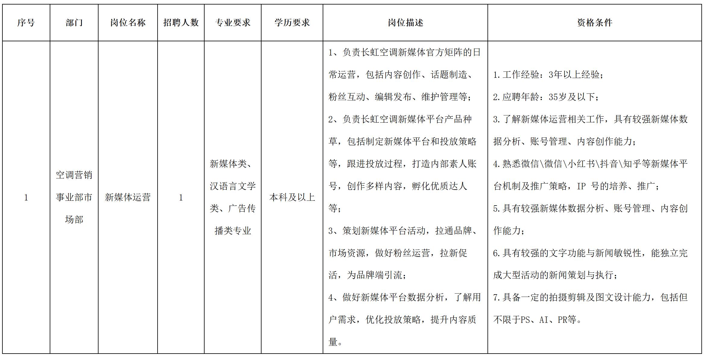 長虹·美菱中國區(qū)營銷總部關(guān)于招聘空調(diào)營銷事業(yè)部市場部新媒體運(yùn)營崗位的公告