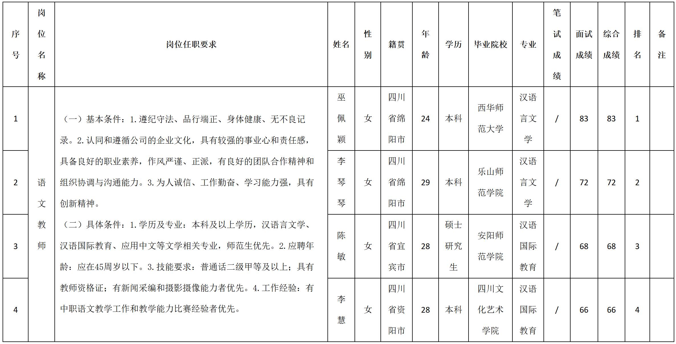 根據(jù)四川九洲教育投資管理有限公司發(fā)布的招聘公告及招聘相關規(guī)定,經(jīng)筆試、面試等程序,現(xiàn)將筆試(面試)成績予以公示。