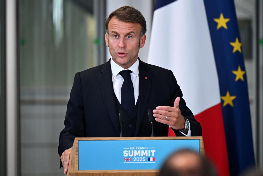 7月10日,法國總統(tǒng)馬克龍?jiān)谟鴤惗亟纪庵Z斯伍德軍事基地出席與英國首相斯塔默(不在畫面中)舉行的聯(lián)合記者會。新華社/法新