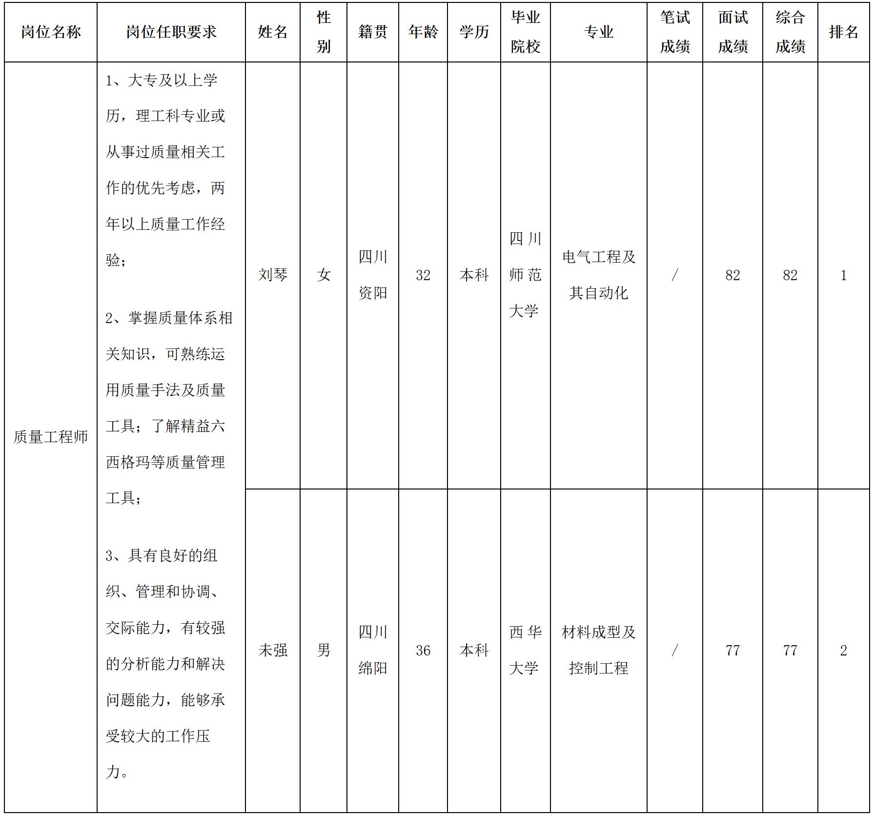 根據(jù)四川華豐科技股份有限公司發(fā)布的招聘公告及招聘相關(guān)規(guī)定,經(jīng)筆試、面試等程序,現(xiàn)將筆試(面試)成績予以公示。