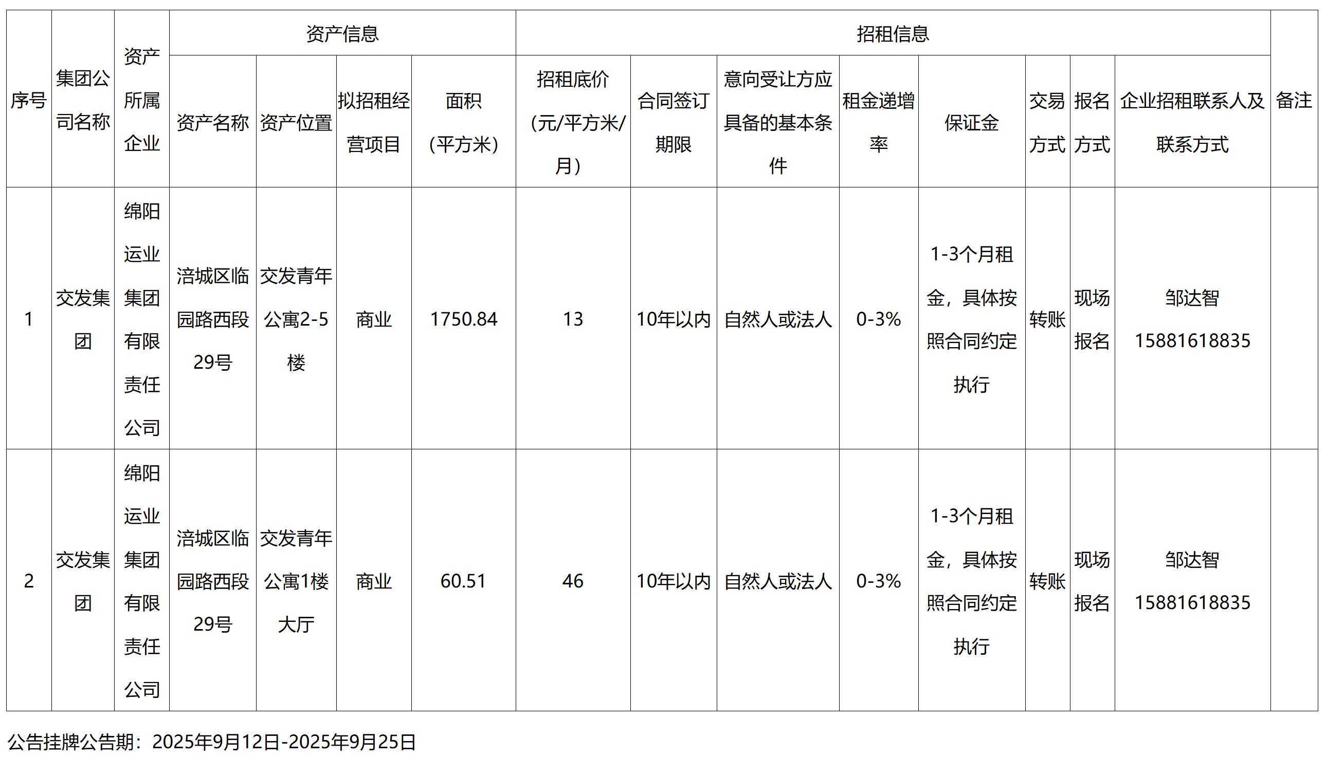 綿陽(yáng)運(yùn)業(yè)集團(tuán)有限責(zé)任公司經(jīng)營(yíng)性資產(chǎn)出租公告