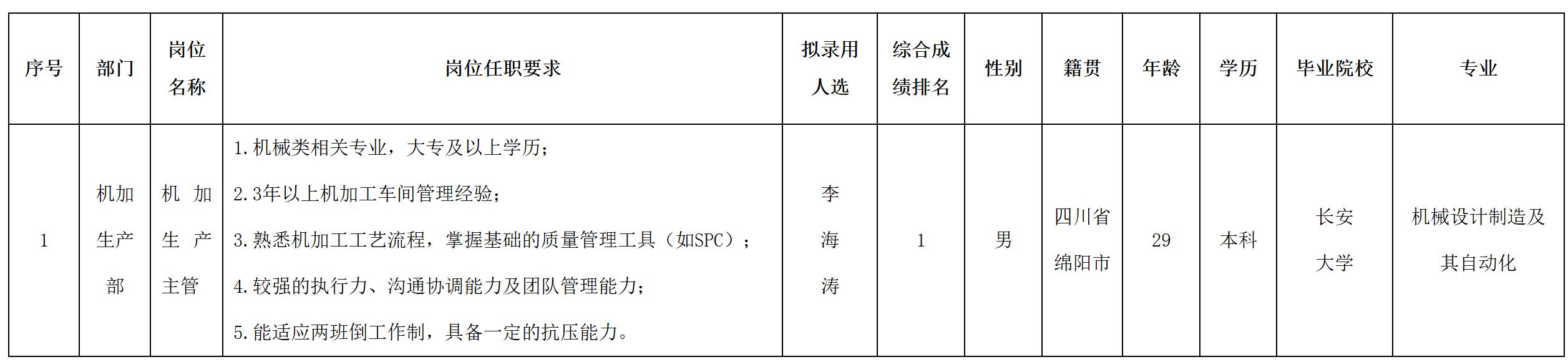 根據(jù)四川波鴻實業(yè)有限公司發(fā)布的招聘公告及招聘相關(guān)規(guī)定,經(jīng)面試、體檢等程序,擬錄用李海濤同志到威斯卡特(綿陽)汽車零部件制造有限公司工作,現(xiàn)予以公示,具體情況如下: