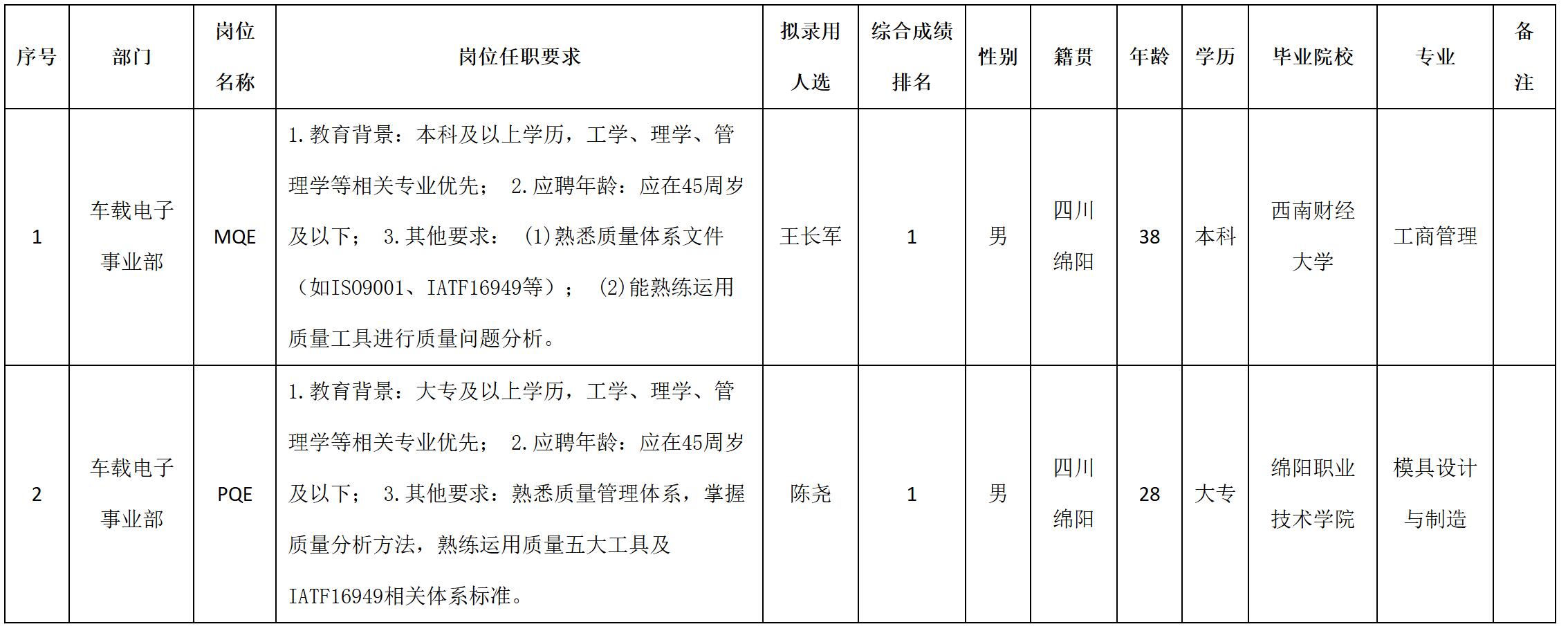 根據(jù)四川九州電子科技股份有限公司發(fā)布的招聘公告及招聘相關(guān)規(guī)定,經(jīng)筆試、面試、考察、體檢等程序,擬錄用王長軍等2名同志到四川九州電子科技股份有限公司工作,現(xiàn)予以公示,具體情況如下: