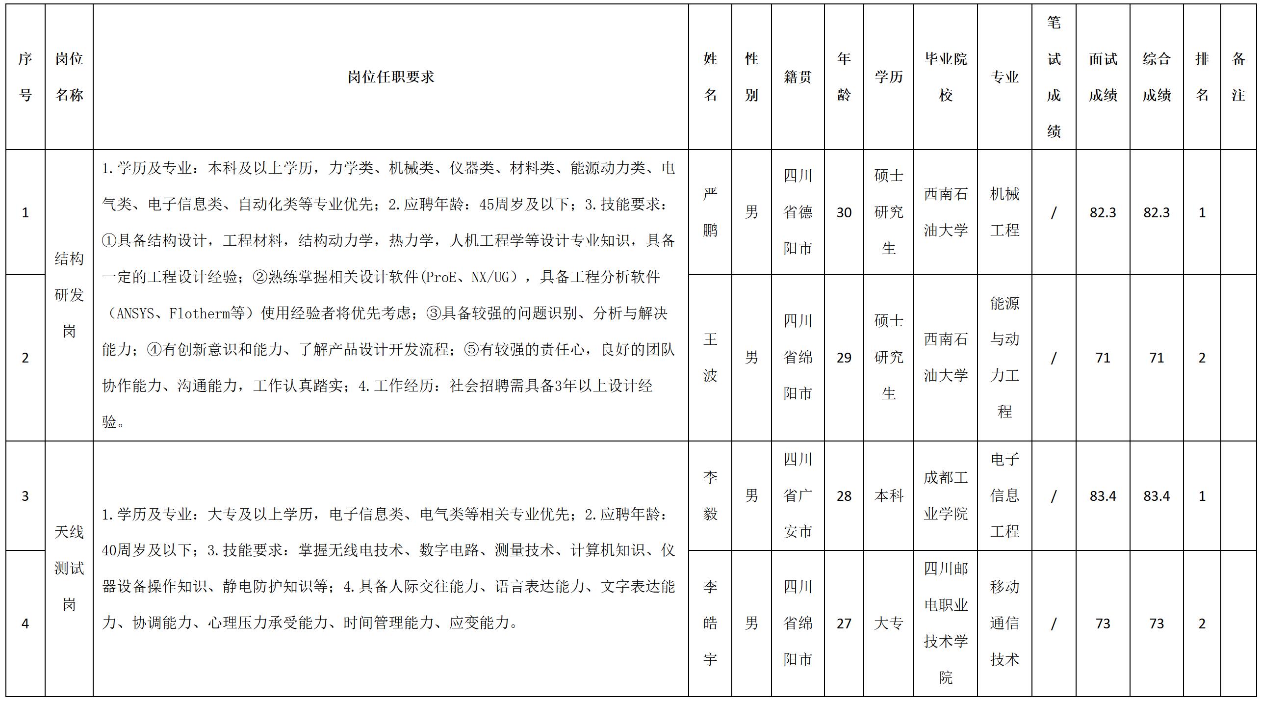根據(jù)四川九洲電器集團有限責(zé)任公司發(fā)布的招聘公告及招聘相關(guān)規(guī)定,經(jīng)筆試、面試等程序,現(xiàn)將筆試(面試)成績予以公示。