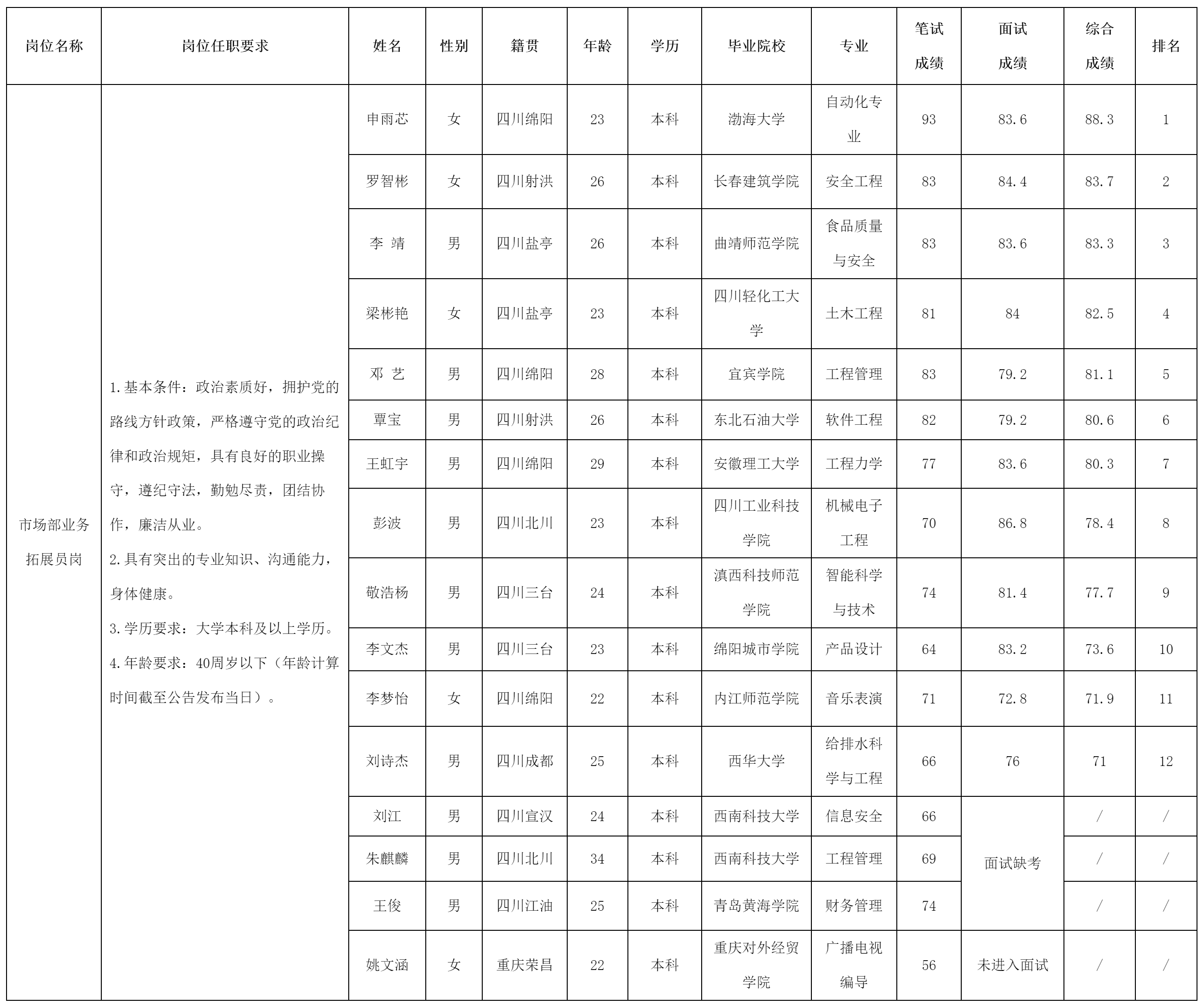 根據(jù)綿陽市建設(shè)工程質(zhì)量檢測(cè)中心有限責(zé)任公司發(fā)布的招聘公告及招聘相關(guān)規(guī)定,現(xiàn)將筆試(面試)成績(jī)予以公示。