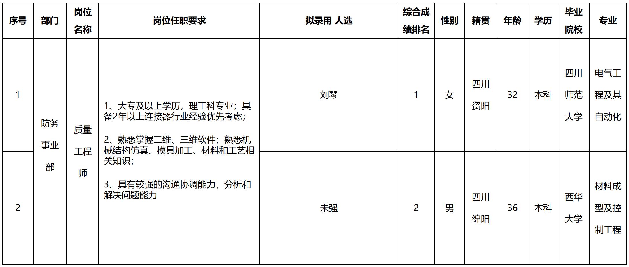 根據(jù)四川華豐科技股份有限公司發(fā)布的招聘公告及招聘相關(guān)規(guī)定,經(jīng)筆試、面試、考察、體檢等程序,擬錄用劉琴等同志到四川華豐科技股份有限公司工作,現(xiàn)予以公示,具體情況如下: