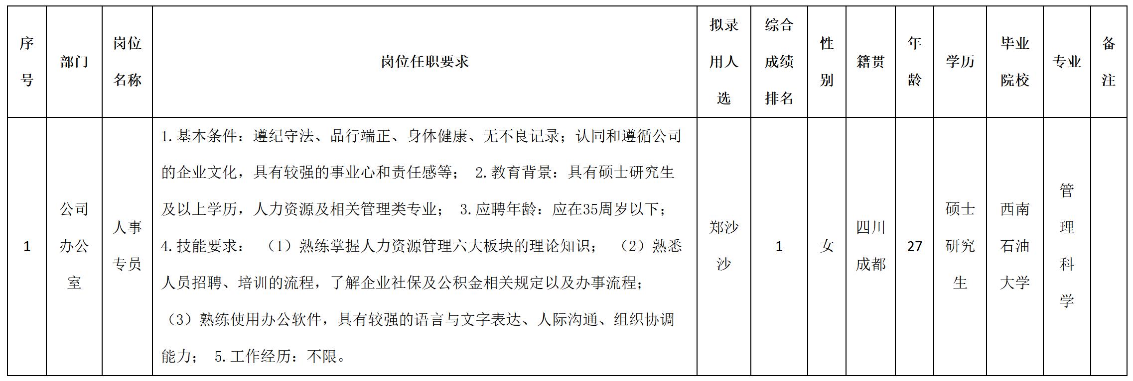 根據四川湖山電器股份有限公司發(fā)布的招聘公告及招聘相關規(guī)定,經筆試、面試、考察、體檢等程序,擬錄用鄭沙沙同志到四川湖山電器股份有限公司工作,現(xiàn)予以公示,具體情況如下: