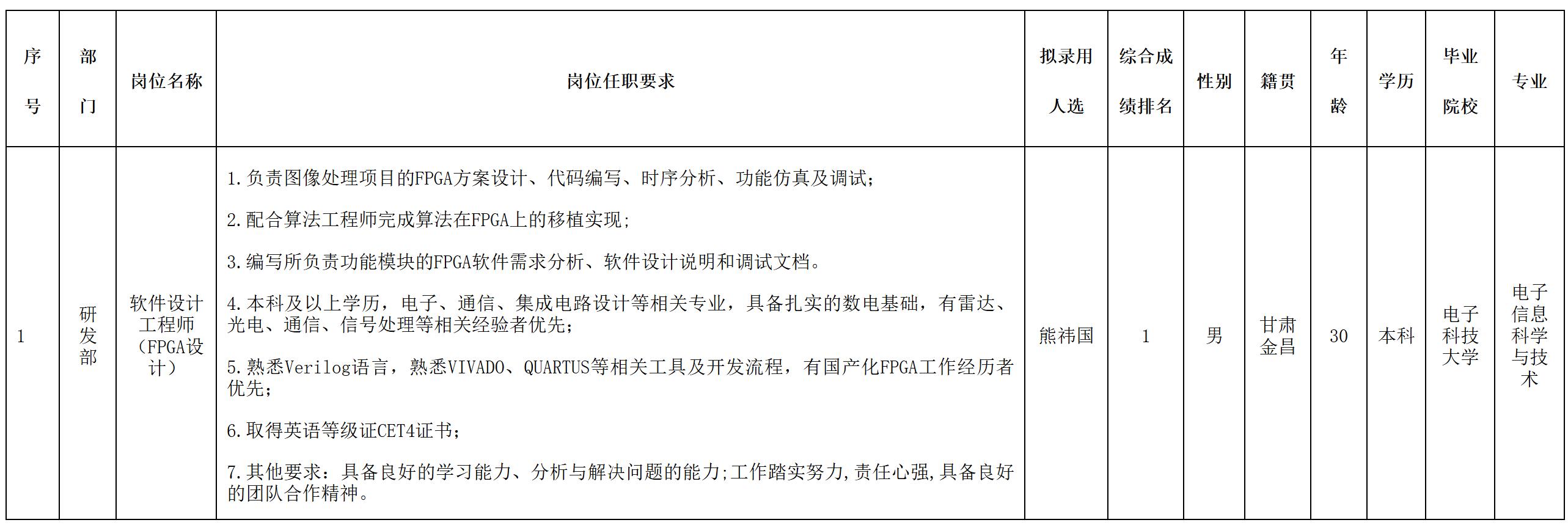 根據(jù)四川長虹電子科技有限公司發(fā)布的招聘公告及招聘相關(guān)規(guī)定,經(jīng)筆試、面試、考察、體檢等程序,擬錄用熊祎國同志到公司研發(fā)部工作,現(xiàn)予以公示,具體情況如下: