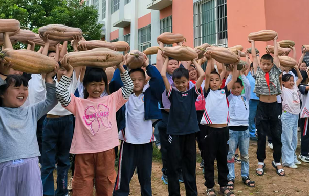 該校校園種植園里,金燦燦的南瓜、胖乎乎的冬瓜、沉甸甸地掛滿藤蔓,綠油油的空心菜在陽光下閃耀著收獲的喜悅。