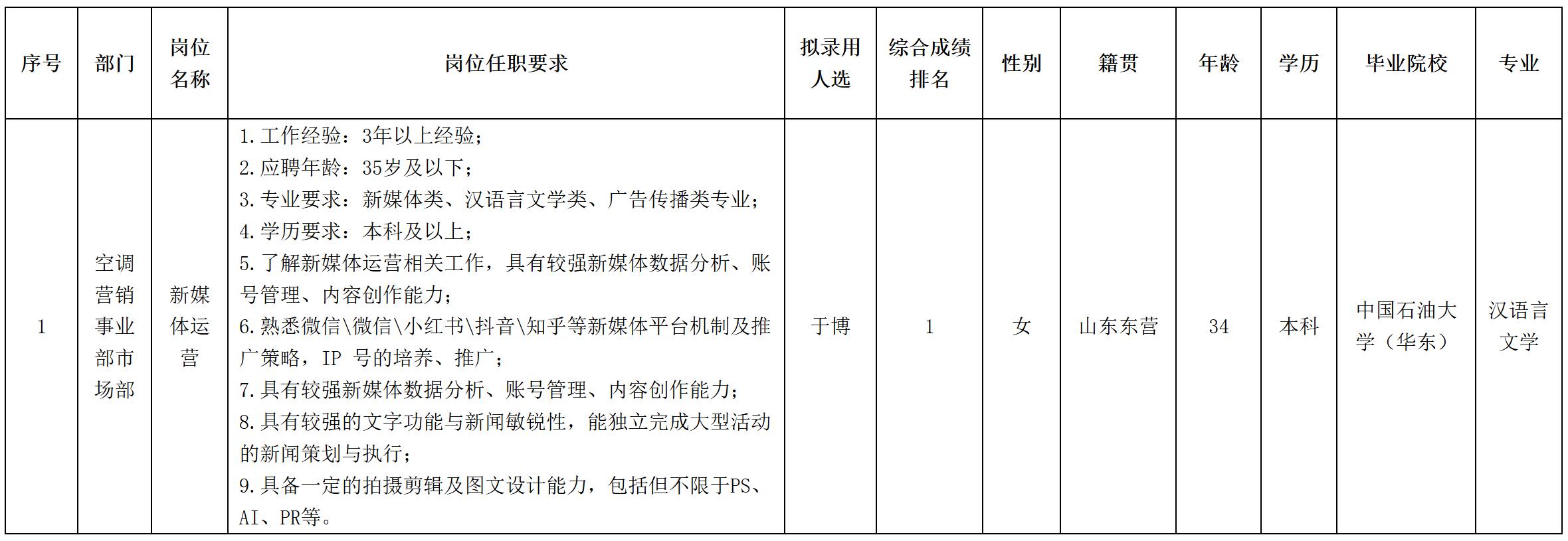 根據(jù)長虹·美菱中國區(qū)營銷總部發(fā)布的招聘公告及招聘相關(guān)規(guī)定,經(jīng)面試、考察、體檢等程序,擬錄用于博同志到公司工作,現(xiàn)予以公示,具體情況如下: