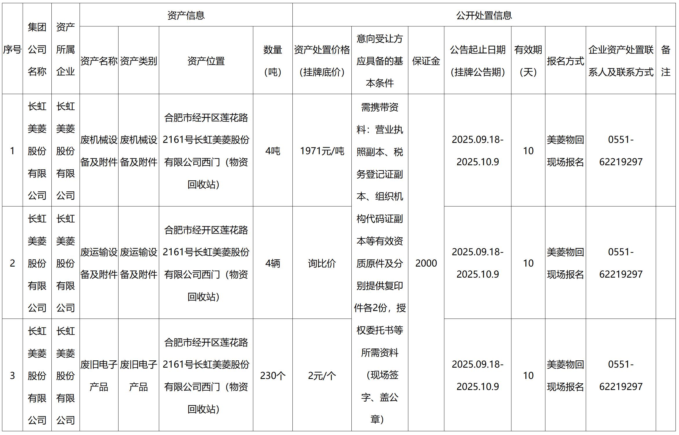 長(zhǎng)虹美菱股份有限公司資產(chǎn)處置公告