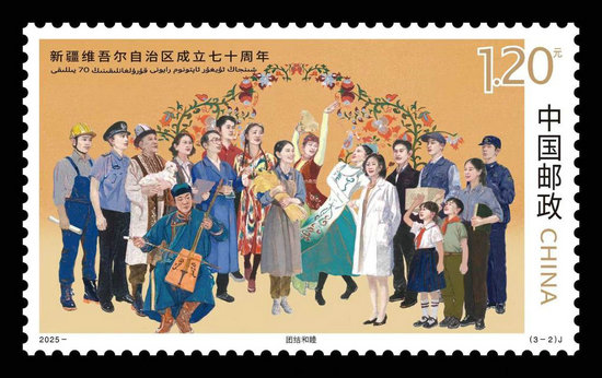 《新疆維吾爾自治區(qū)成立七十周年》紀念郵票。(新疆郵政供圖)