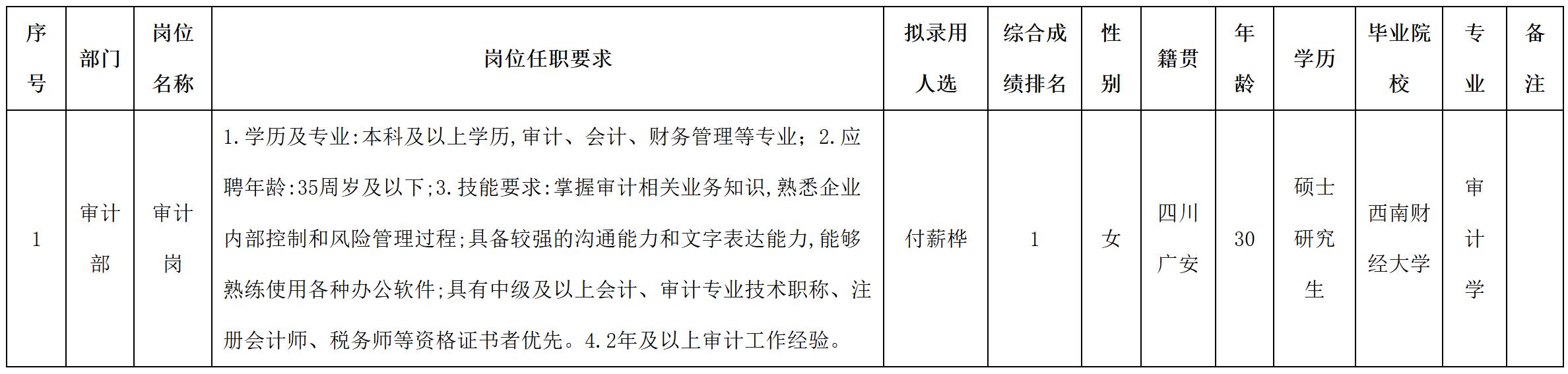 根據(jù)四川九洲電器股份有限公司發(fā)布的招聘公告及招聘相關(guān)規(guī)定,經(jīng)筆試、面試、考察、體檢等程序,擬錄用付薪樺同志到四川九洲電器股份有限公司工作,現(xiàn)予以公示,具體情況如下:
