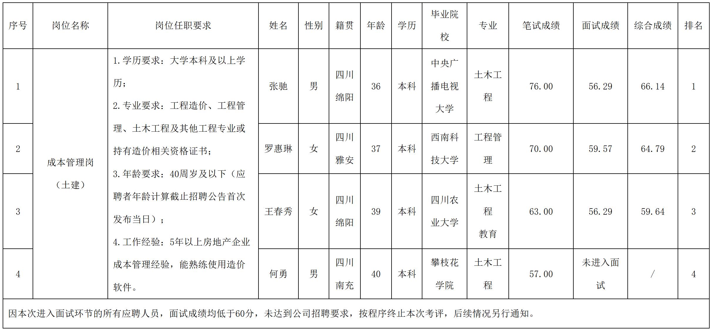 根據(jù)綿陽(yáng)市綿投置地有限公司發(fā)布的招聘公告及招聘相關(guān)規(guī)定,經(jīng)筆試、面試等程序,現(xiàn)將筆試、面試成績(jī)予以公示。