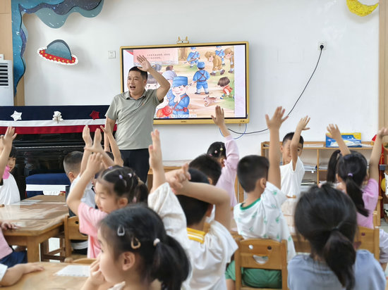 活動中,黨支部書記龔蓉聲情并茂地講述《哪年的九一八》故事,帶領(lǐng)孩子們初步感知歷史,通過展示老照片、模仿防空警報聲等趣味形式,讓孩子們輕輕觸摸那段歲月的印記;黨支部副書記王太平則為孩子帶來《雞毛信》的故事,用生動語言展現(xiàn)海娃的機智勇敢,孩子們屏息凝神沉浸其中,悄然理解了“責(zé)任”與“勇敢”的含義;黨員干部何楠分享經(jīng)典紅色故事《王二小》,當講到王二小為掩護鄉(xiāng)親英勇犧牲時,孩子們眼中滿是崇敬與惋惜,教師適時引導(dǎo),讓孩子們懂得如今的幸福生活來之不易,要珍惜和平、感恩先烈。