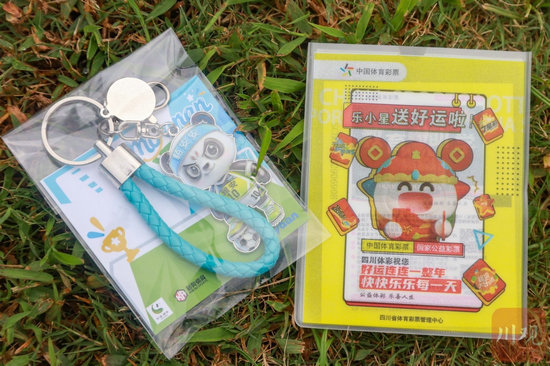 雅安為球迷準(zhǔn)備的盲盒里,可以開(kāi)出“隱藏款”大樂(lè)透體育彩票、川超吉祥物“貊安安”限量版鑰匙扣等。黃剛 攝