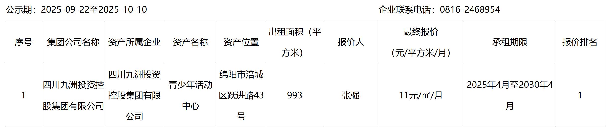 四川九洲投資控股集團(tuán)有限公司資產(chǎn)出租結(jié)果公示