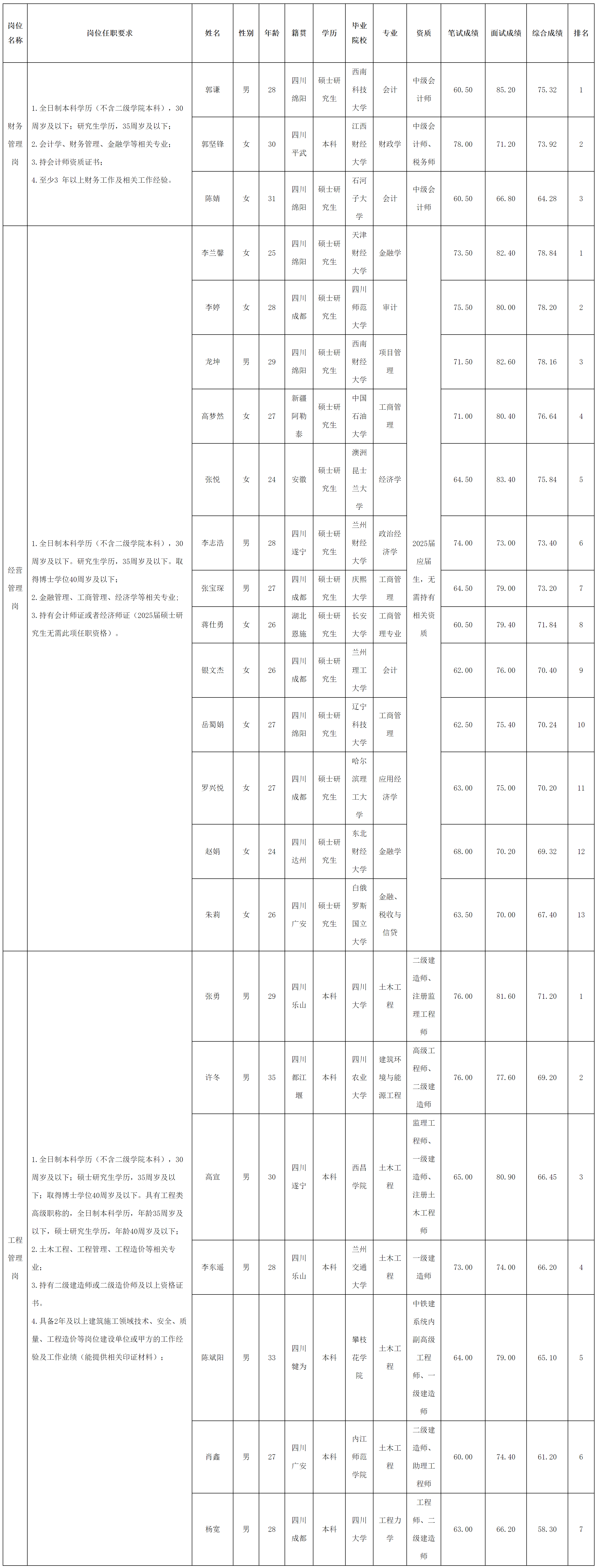 根據(jù)綿陽機場(集團)有限公司2025年8月發(fā)布的《關于2025年秋季招聘財務管理等崗位的公告》以及招聘相關規(guī)定,現(xiàn)將財務管理崗、經(jīng)營管理崗、工程管理崗筆試、面試、綜合成績按照排名予以公示。