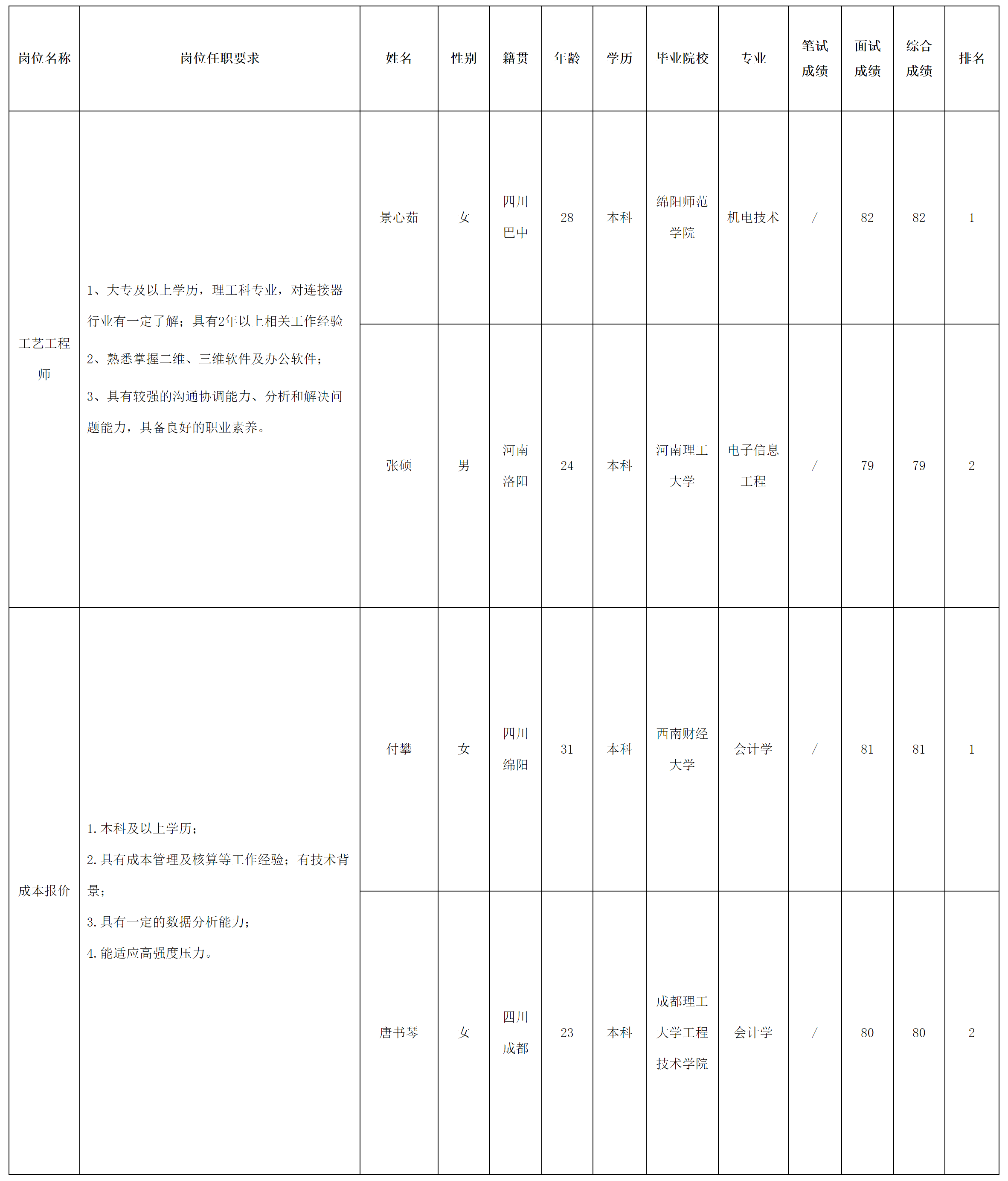 根據(jù)四川華豐科技股份有限公司發(fā)布的招聘公告及招聘相關(guān)規(guī)定,經(jīng)面試等程序,現(xiàn)將面試成績予以公示。