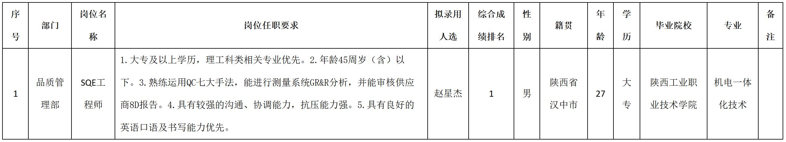 根據(jù)四川安和精密電子電器股份有限公司發(fā)布的招聘公告及招聘相關(guān)規(guī)定,經(jīng)測(cè)試、考察、體檢等程序,擬錄用趙星杰同志到四川安和精密電子電器股份有限公司工作,現(xiàn)予以公示,具體情況如下: