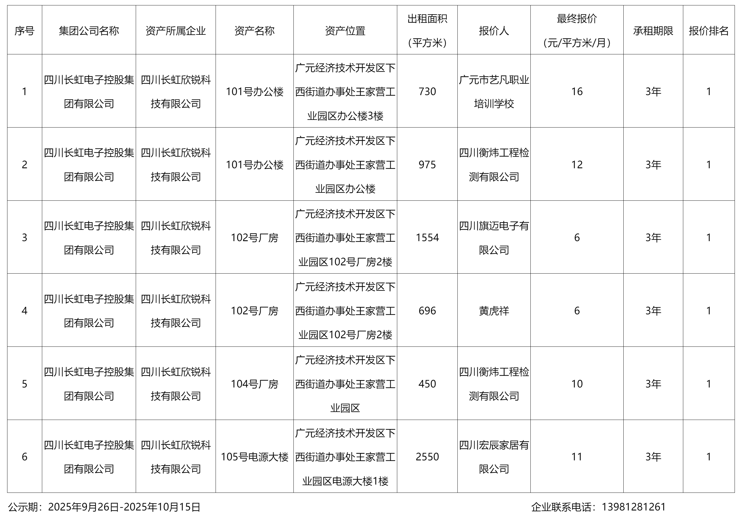 四川長虹欣銳科技有限公司資產(chǎn)出租結(jié)果公示