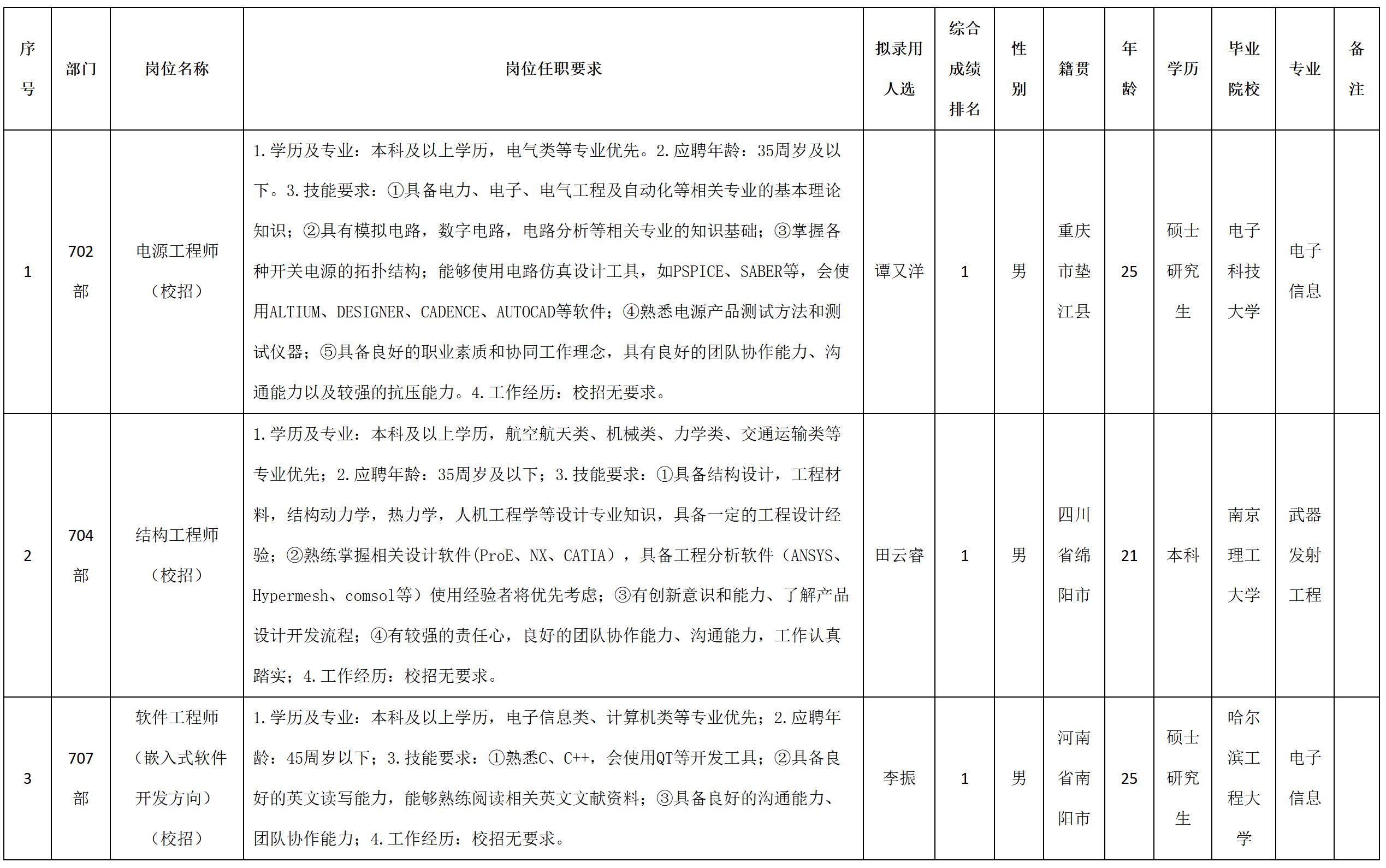 根據(jù)四川九洲電器集團(tuán)有限責(zé)任公司發(fā)布的招聘公告及招聘相關(guān)規(guī)定,經(jīng)測試、考察、體檢等程序,擬錄用譚又洋等3名同志到四川九洲電器集團(tuán)有限責(zé)任公司工作,現(xiàn)予以公示,具體情況如下: