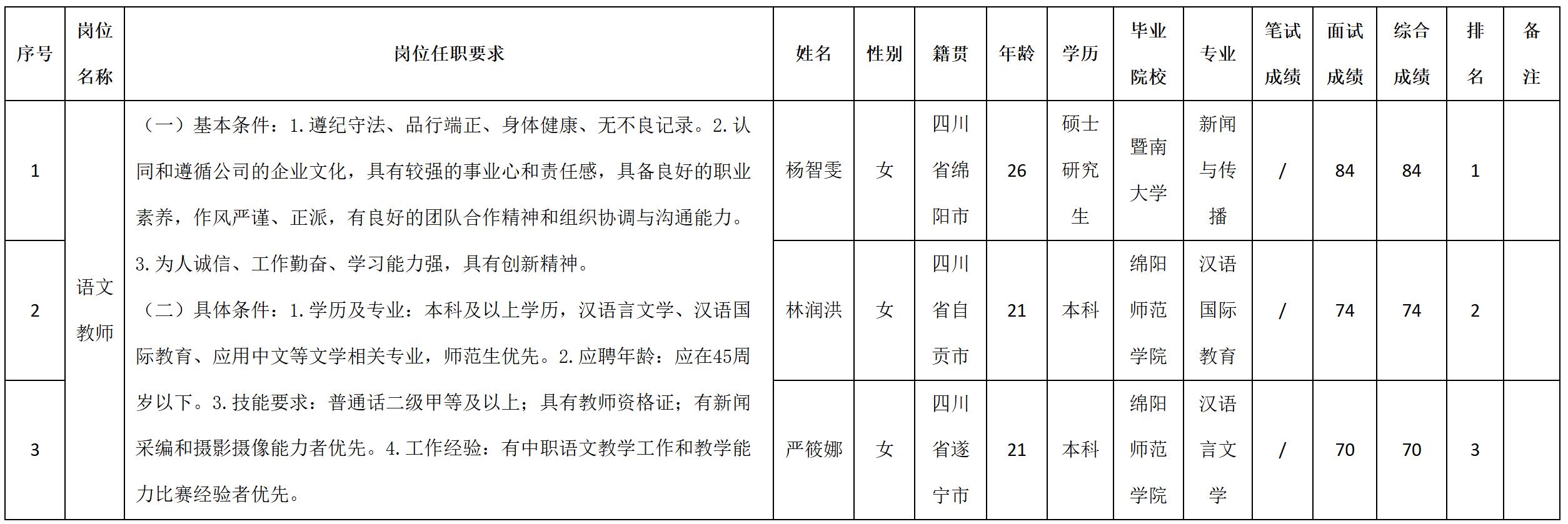 根據(jù)四川九洲教育投資管理有限公司發(fā)布的招聘公告及招聘相關(guān)規(guī)定,現(xiàn)將測試成績予以公示。
