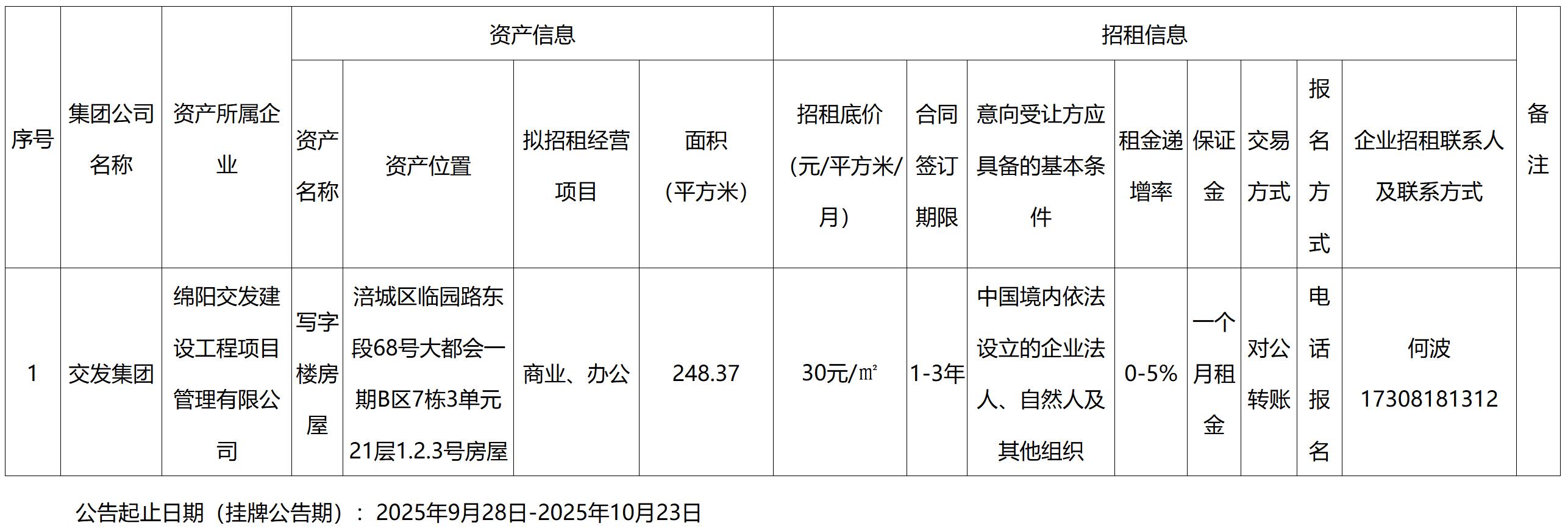 綿陽交發(fā)建設(shè)工程項(xiàng)目管理有限公司經(jīng)營性資產(chǎn)招租公告