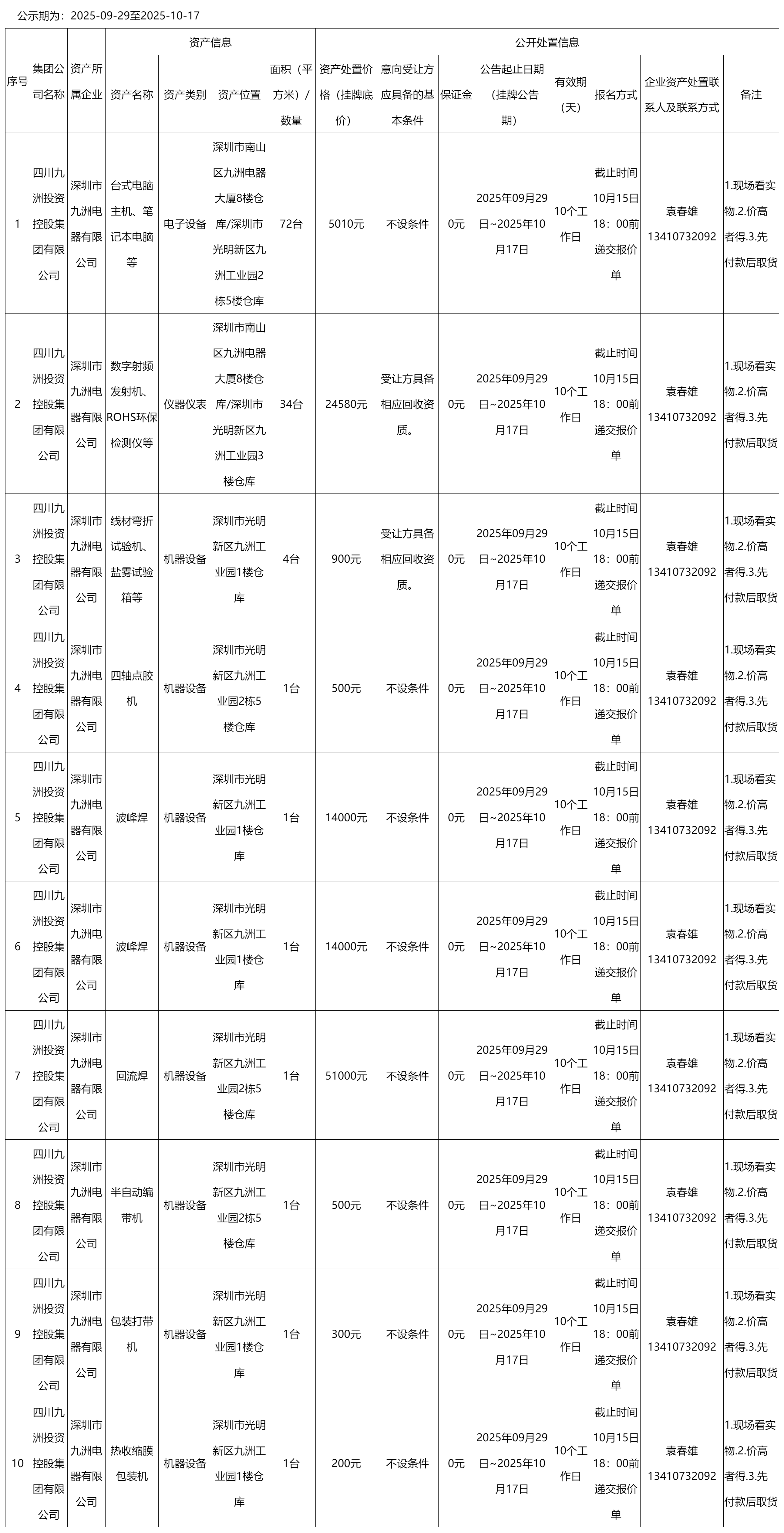 深圳市九洲電器有限公司資產(chǎn)處置公告